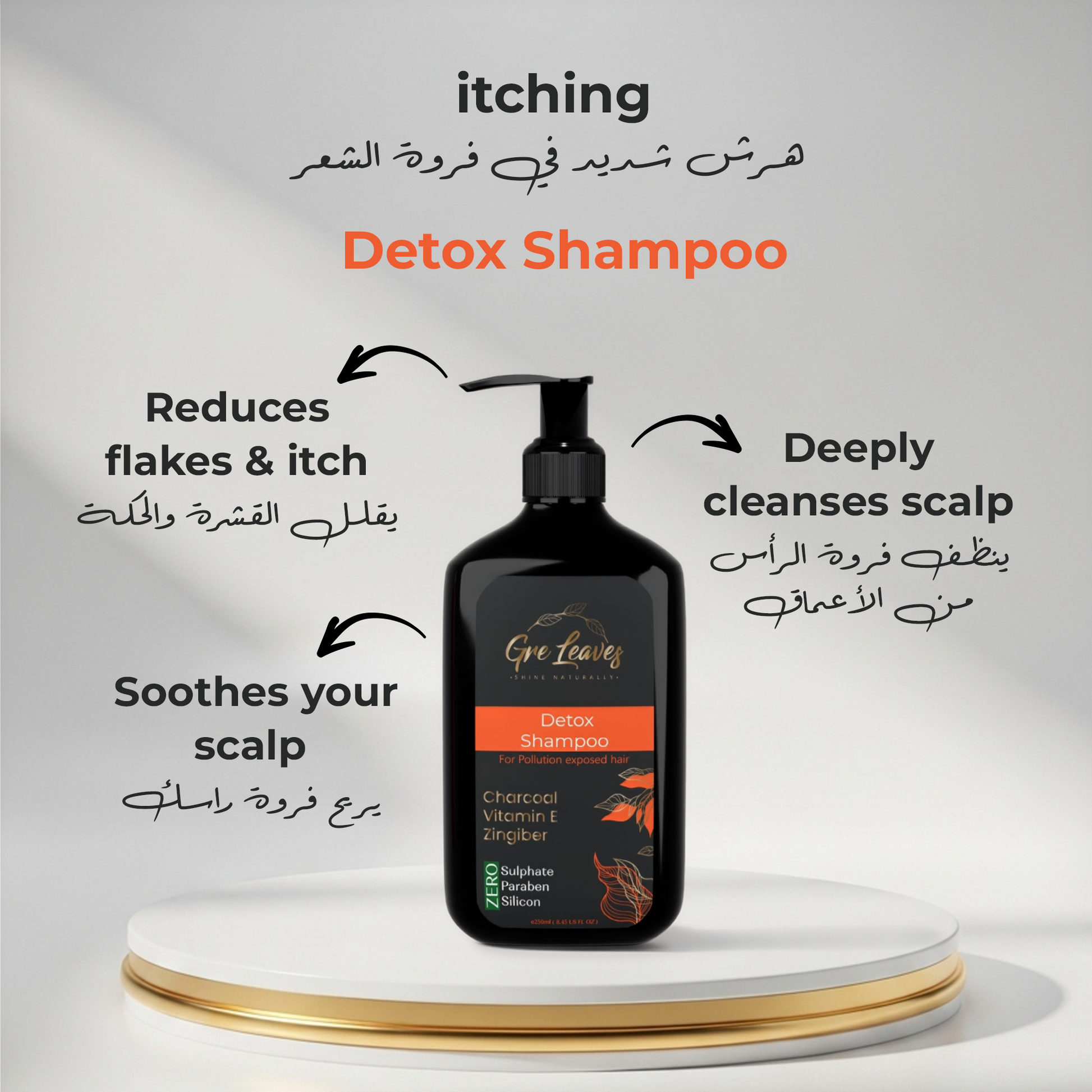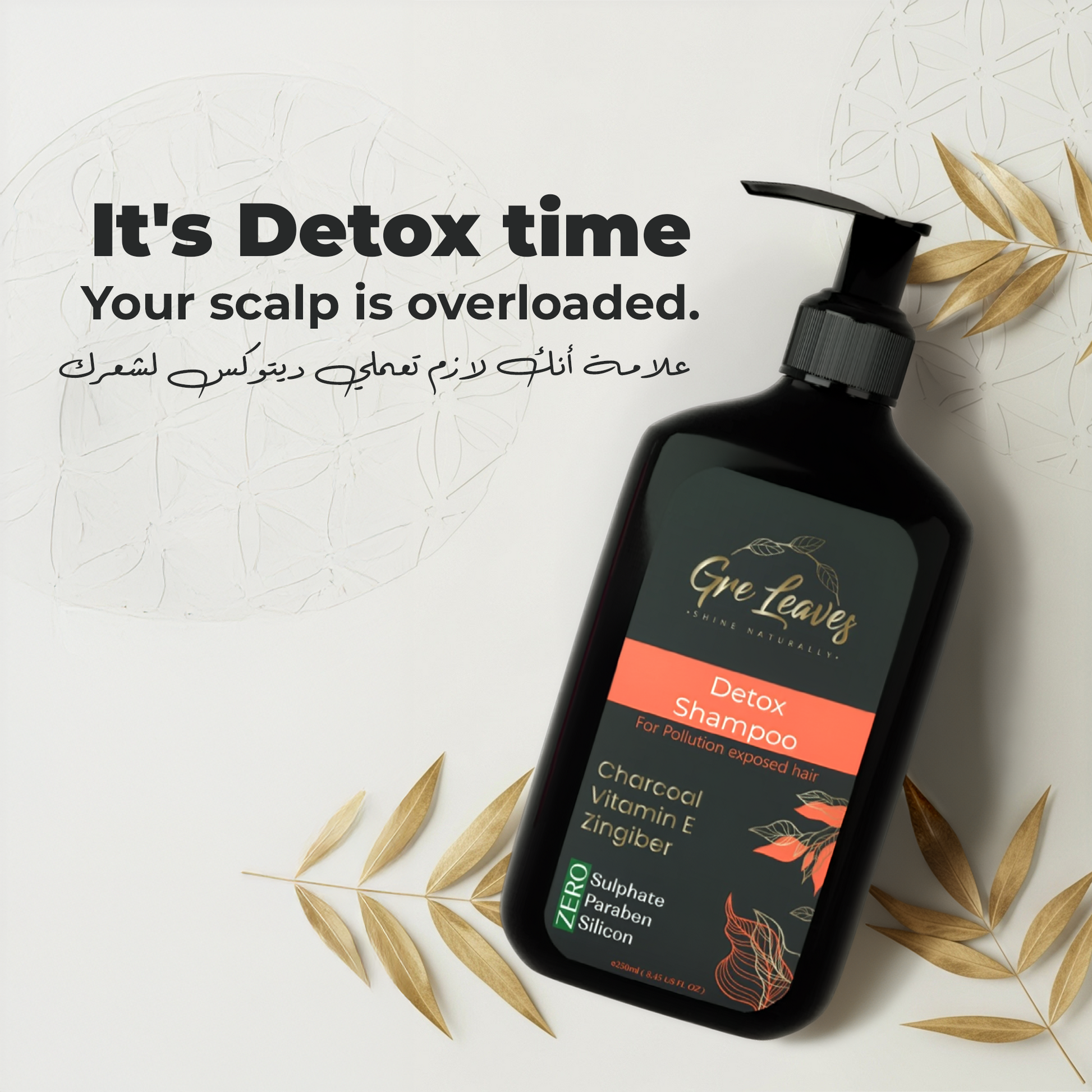 Use GreLeaves Detox Shampoo to deeply cleanse and purify. Leave on scalp for 3 minutes, massage gently, then rinse thoroughly.