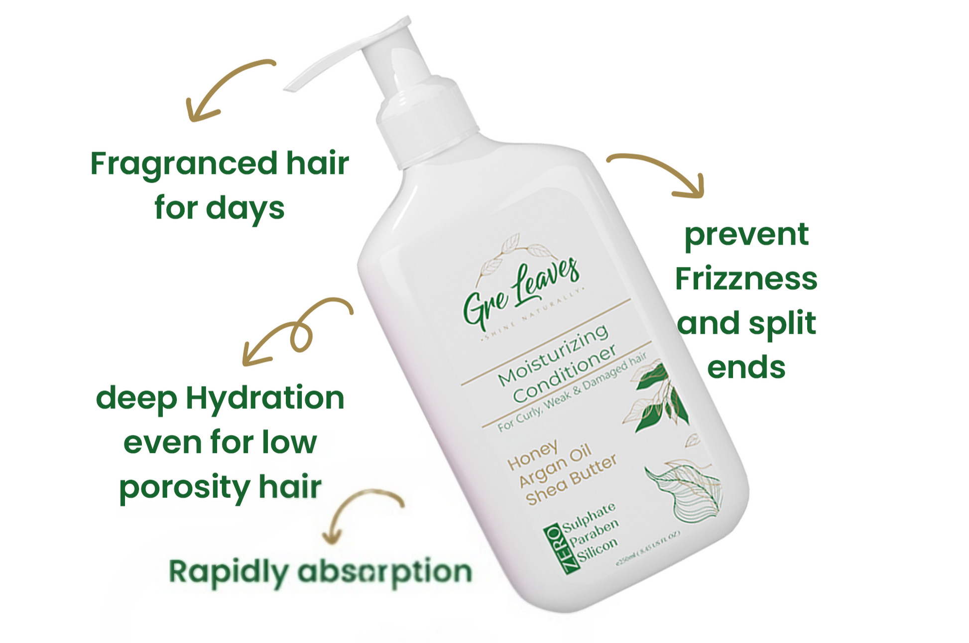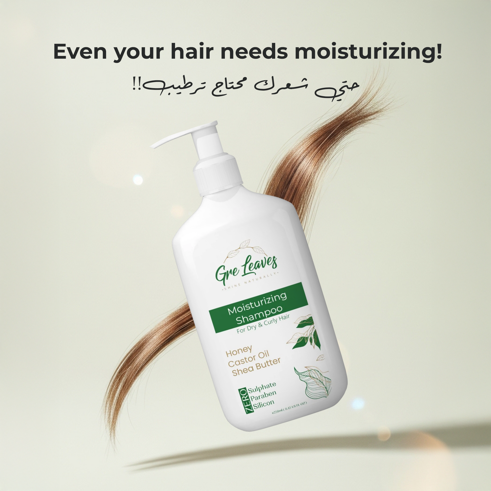 Complete your hair care ritual with GreLeaves Moisturizing Conditioner, a luxurious formula designed for frizzy, dry, and damaged hair. Crafted with a natural blend of Honey, Moroccan Argan Oil, and Shea Butter, this conditioner restores moisture, softness, and elasticity to even the most compromised strands.